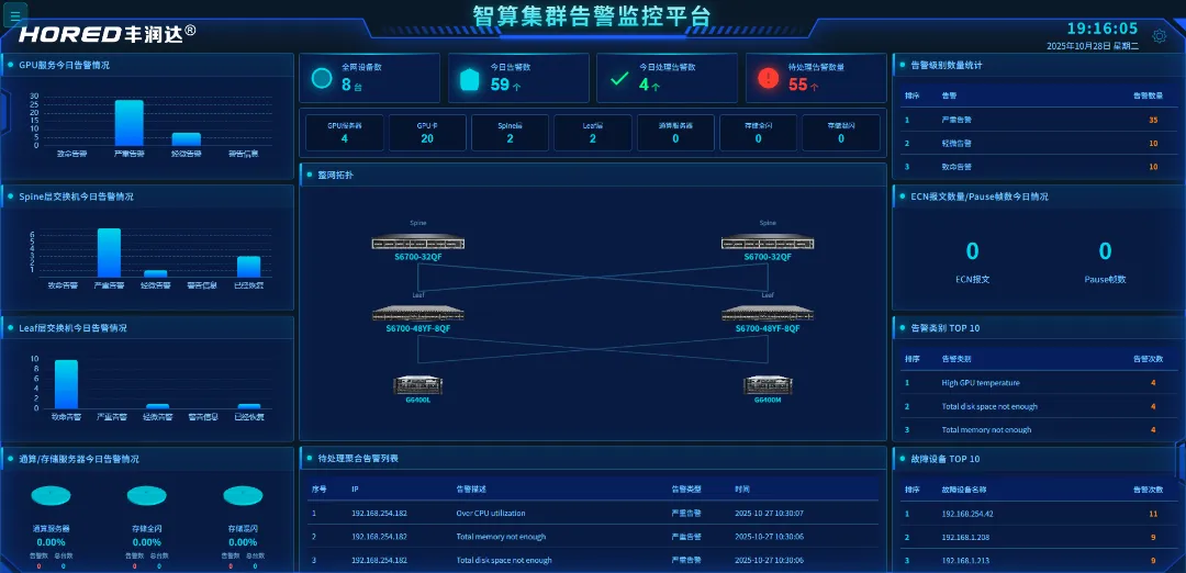 面对成百上千台服务器与网络设备组成的大规模集群,传统人工运维方式效率低下。丰润达推出的 “384超节点智算运维平台”,正是为了解决大规模IT设施的集中监控与智能运维痛点。