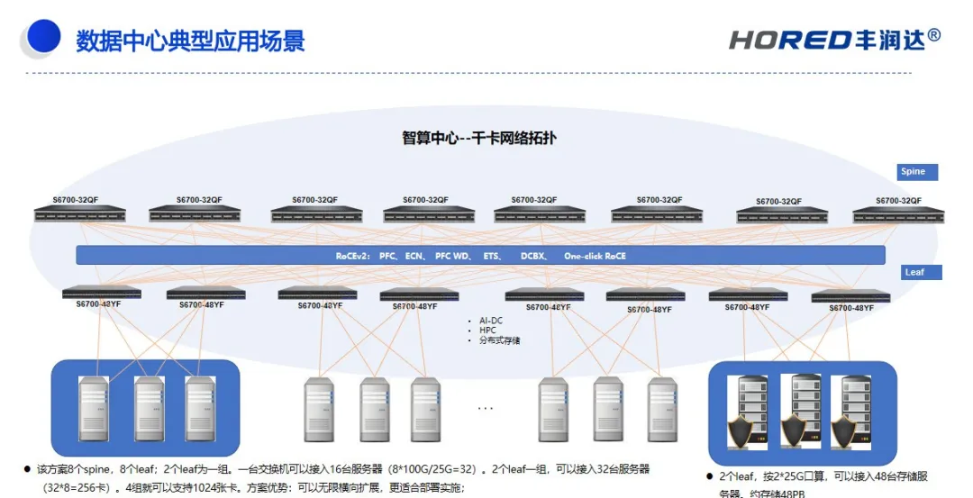 在扩展性方面,Spine-Leaf支持灵活的水平扩展:增加Spine交换机可提升带宽,扩展Leaf层则可接入更多计算节点。这种模块化扩展模式有效避免了传统网络的升级瓶颈,助力客户实现算力基础设施的平滑演进。